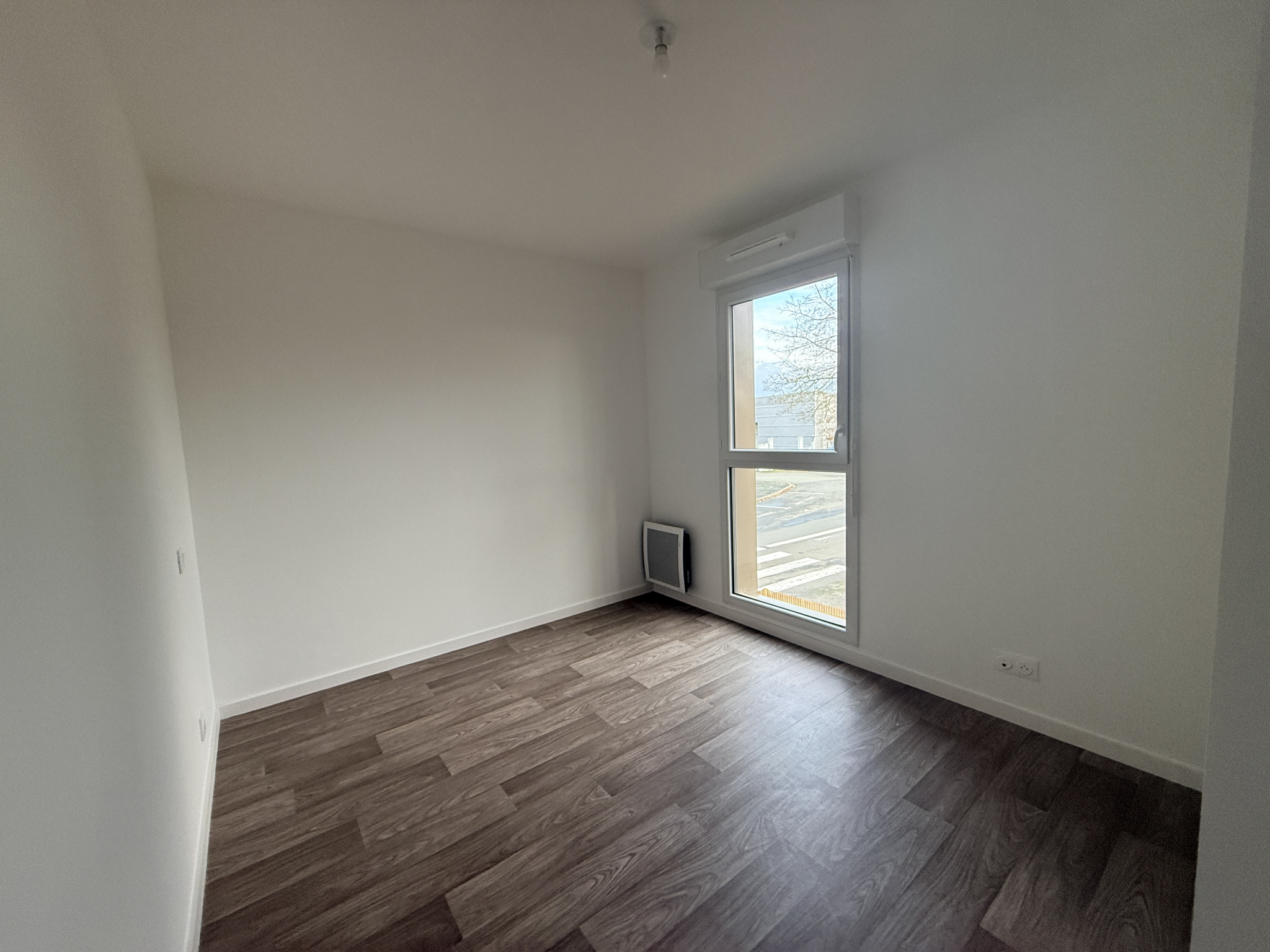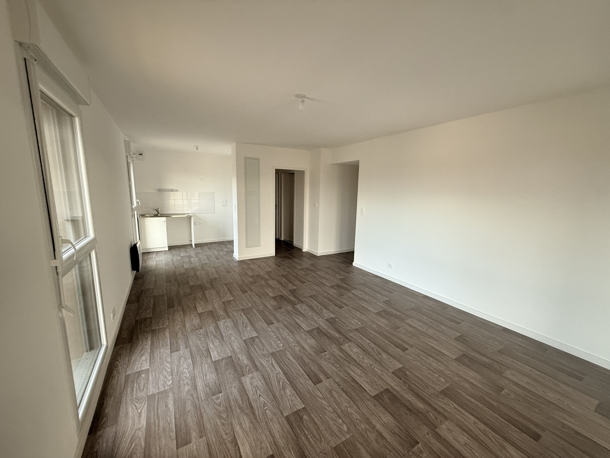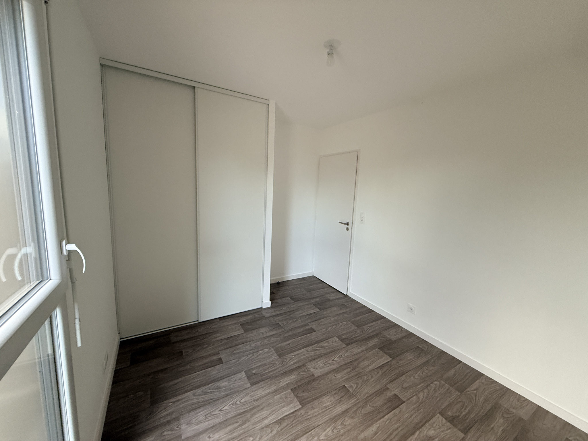 Appartement de type 3, situé au 1er étage, offrant : entrée, wc, pièce de vie avec cuisine ouverte, dégagement avec placard desservant cellier, 2 chambres, salle d'eau.