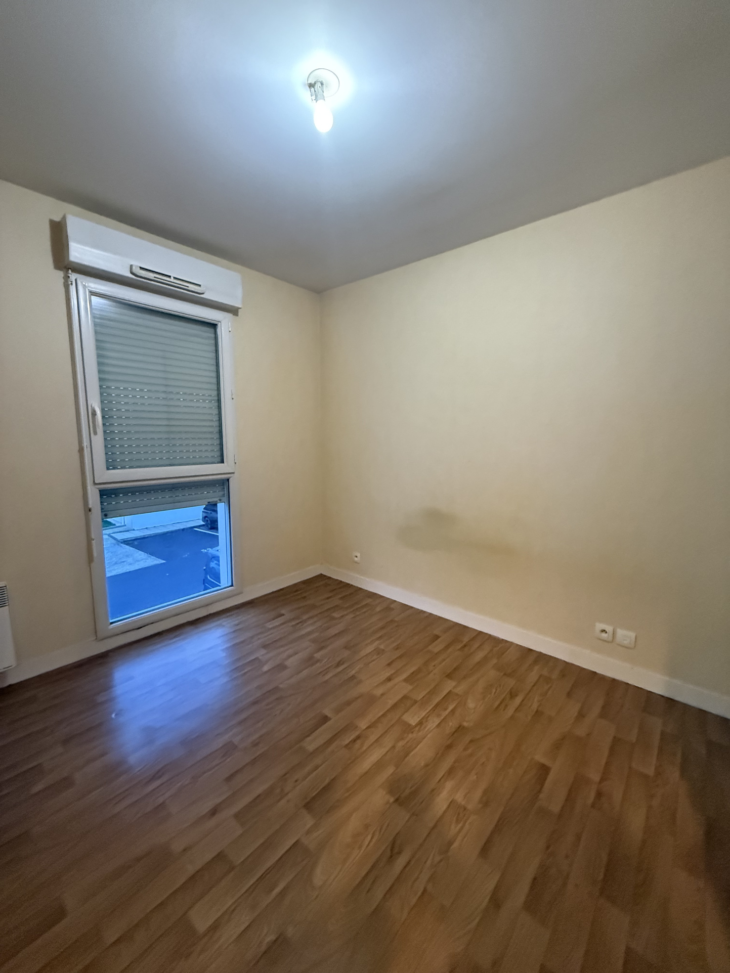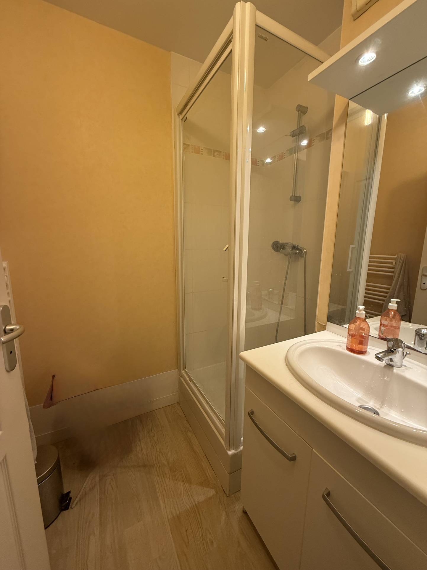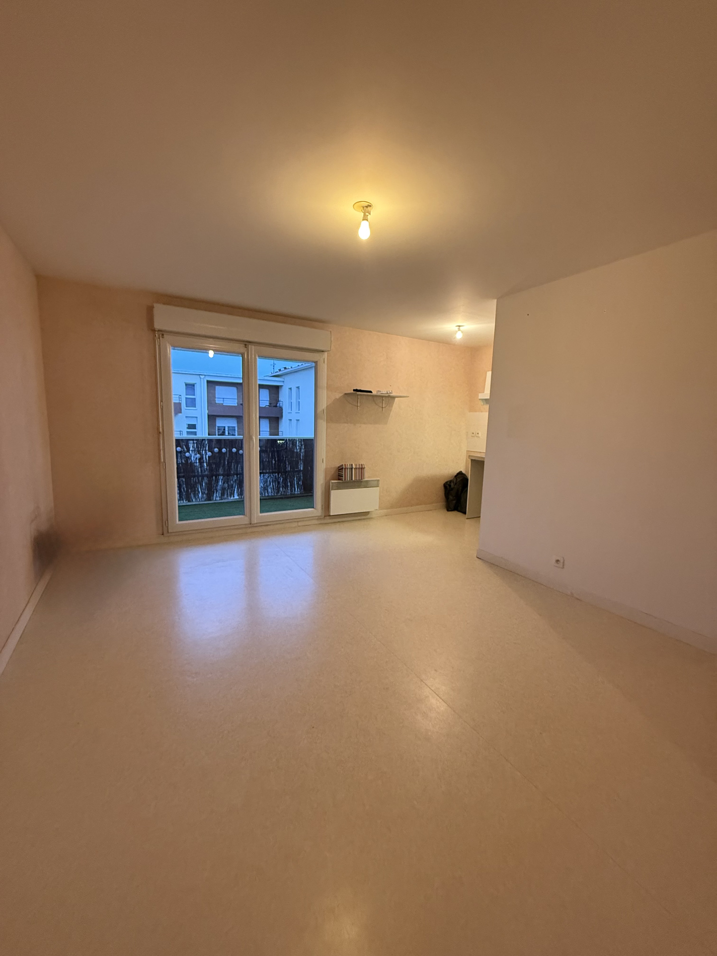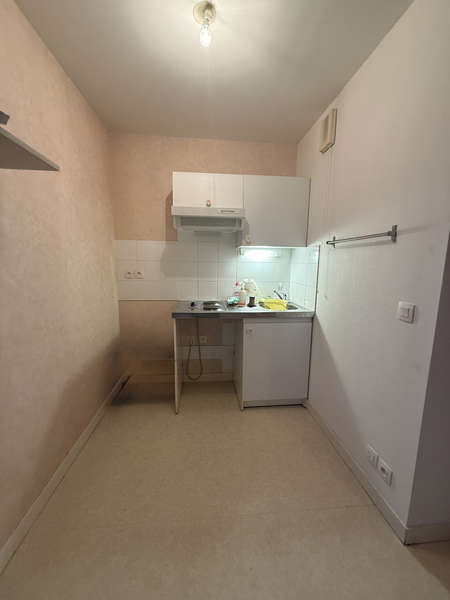 Entrée, séjour, coin cuisine équipé (plaque de cuisson, frigo, hotte), chambre avec placard, salle d'eau, wc.