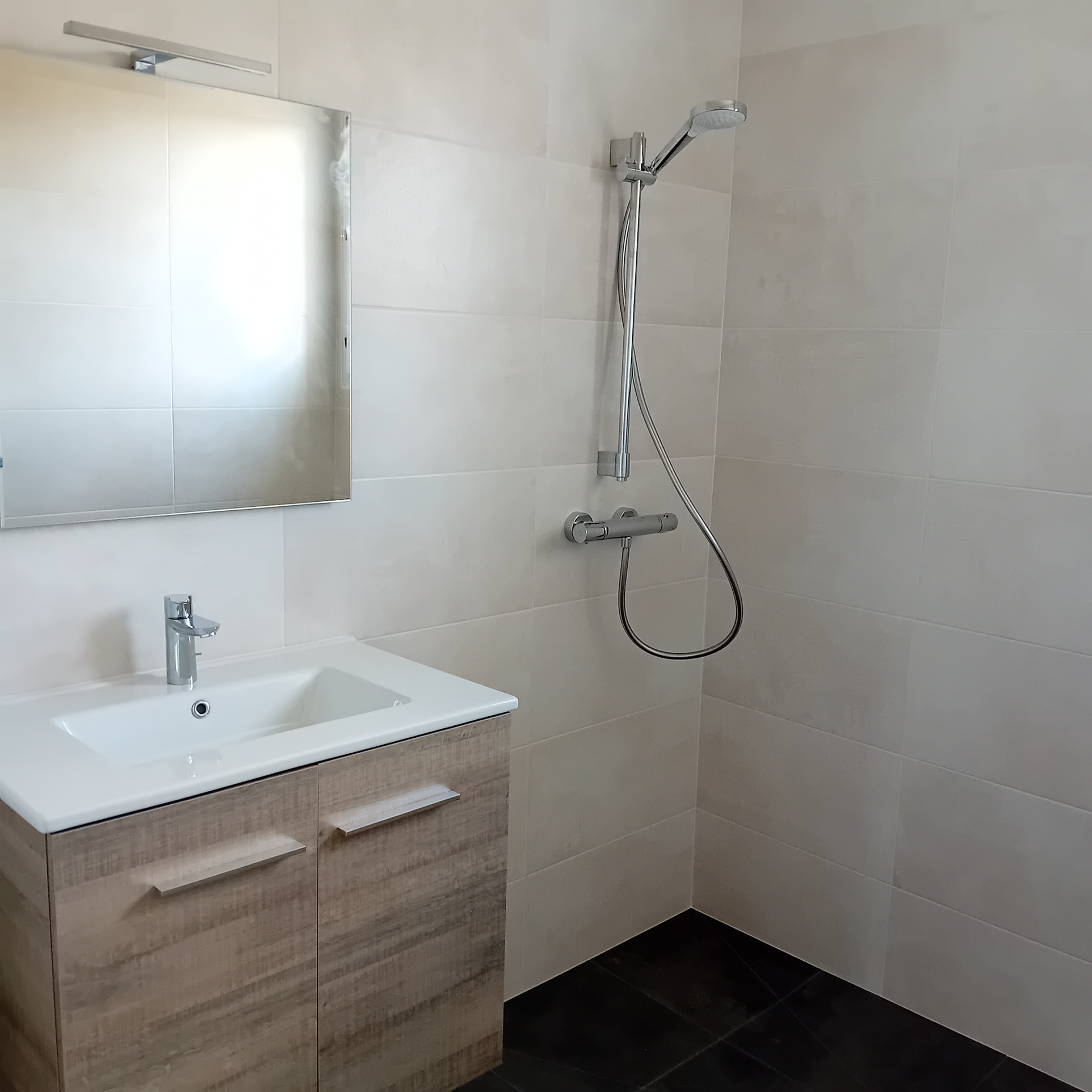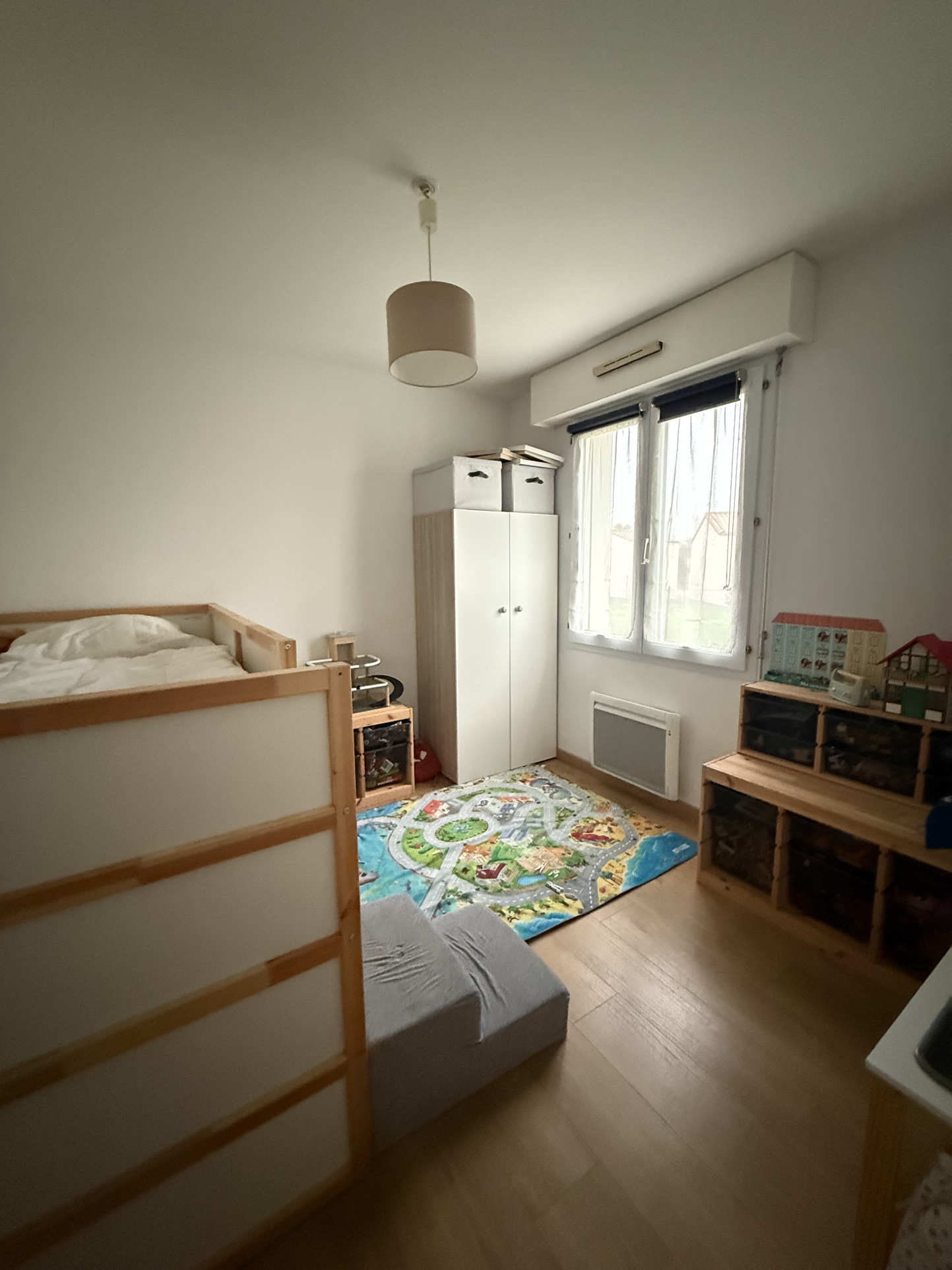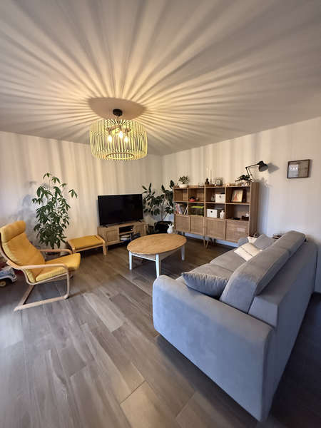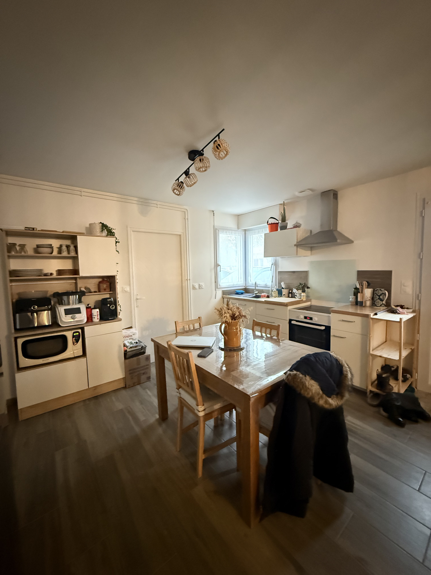 Entrée sur pièce de vie avec coin cuisine, 2 chambres, salle d'eau & wc