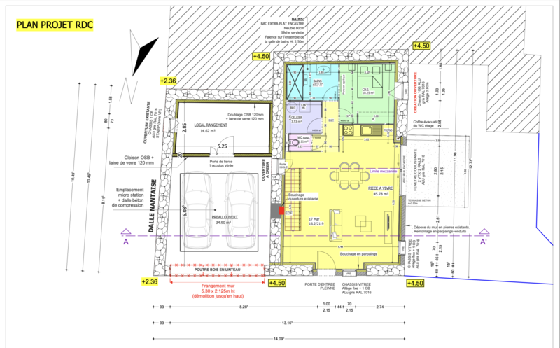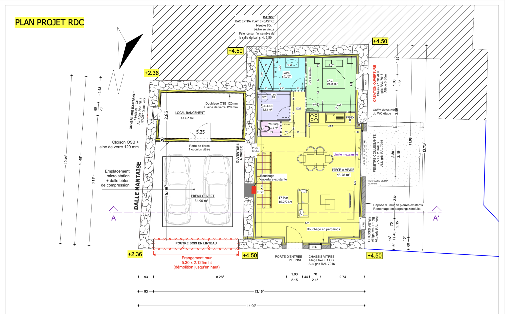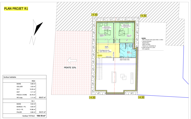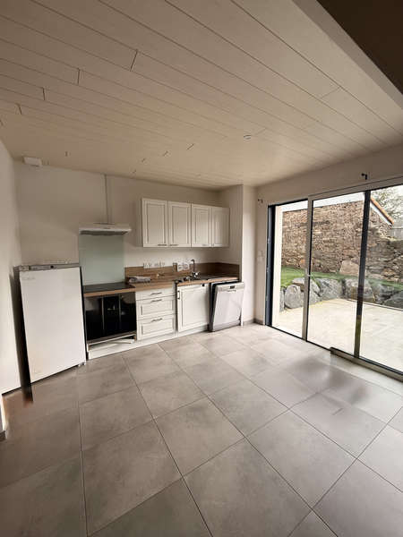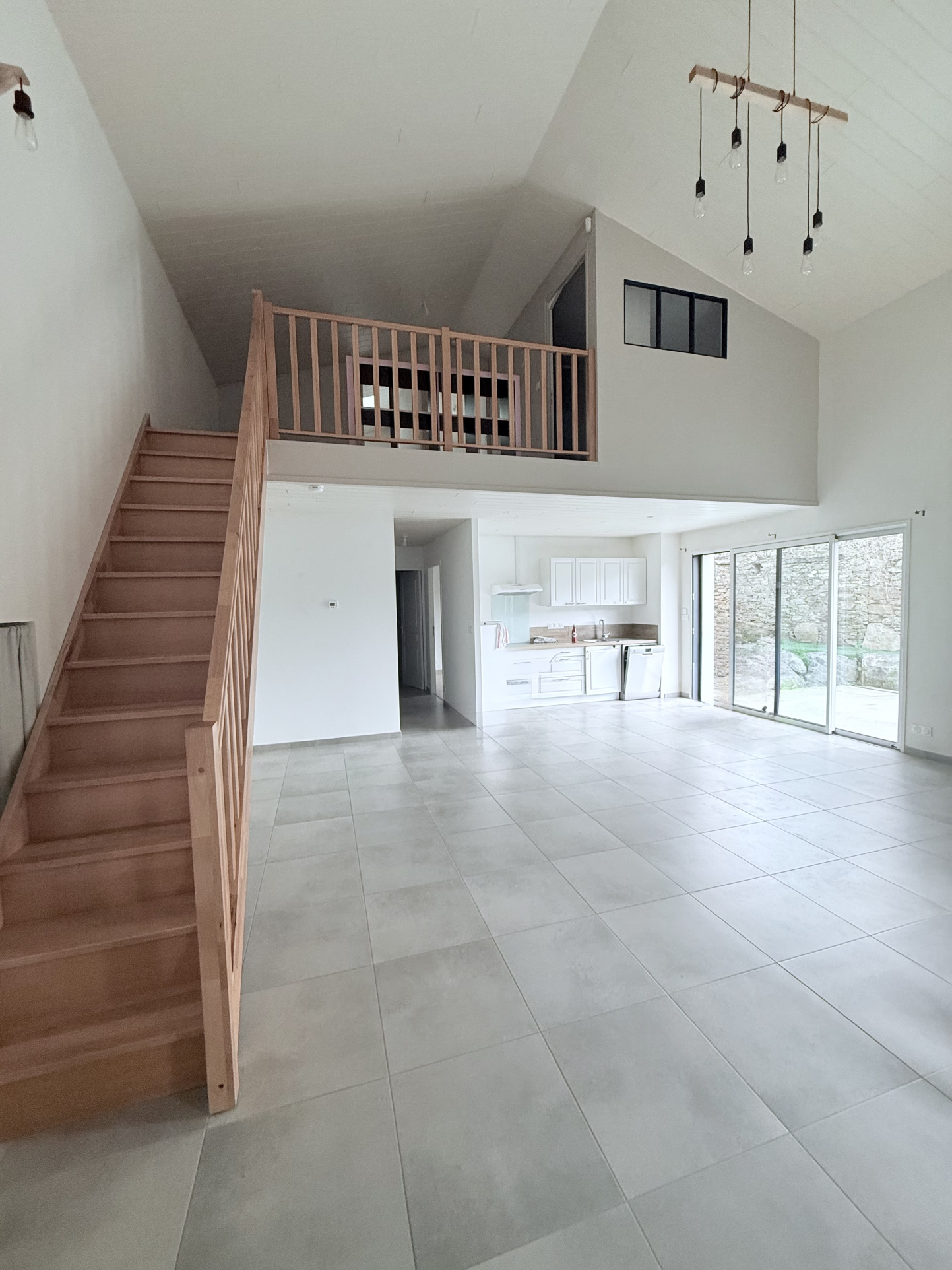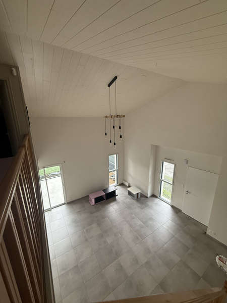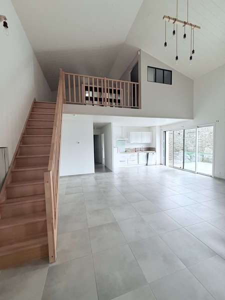 Au rez-de-chaussée : entrée sur séjour-salon avec cuisine ouverte (hotte & plaques de cuisson induction), cellier, 1 chambre avec placard, salle d'eau & wc
