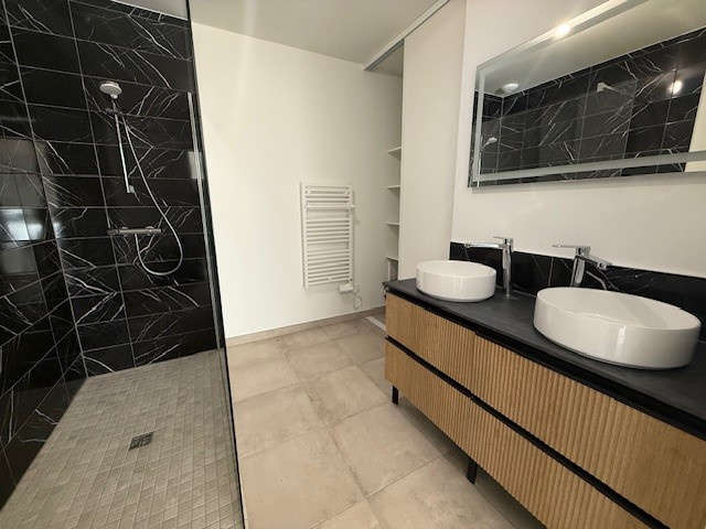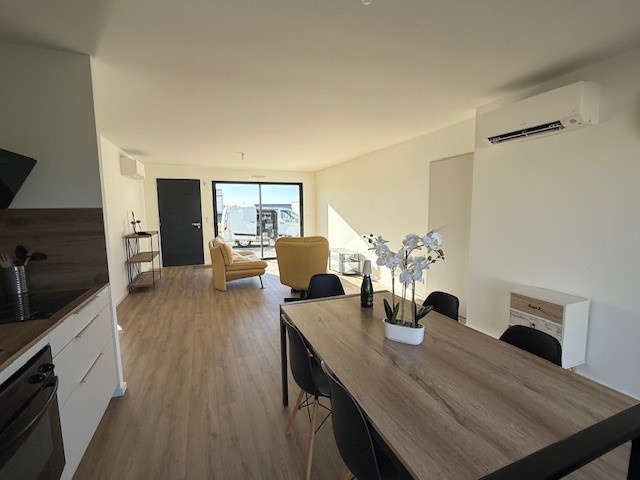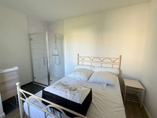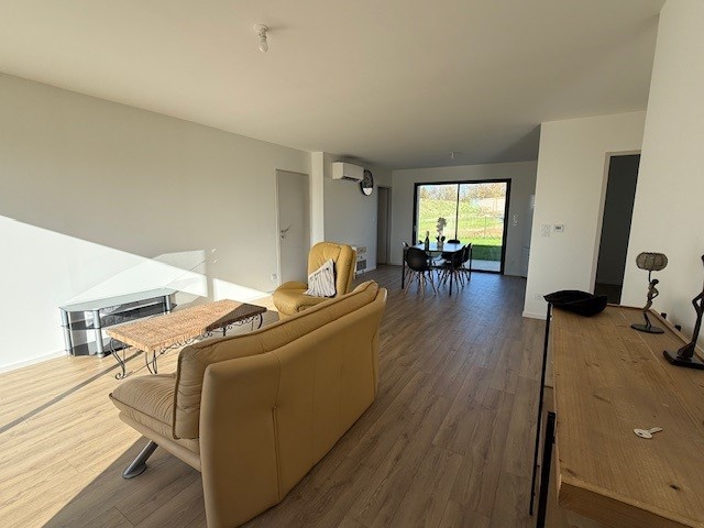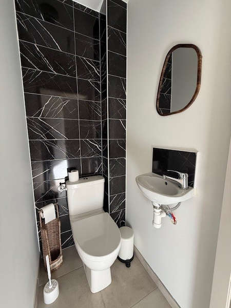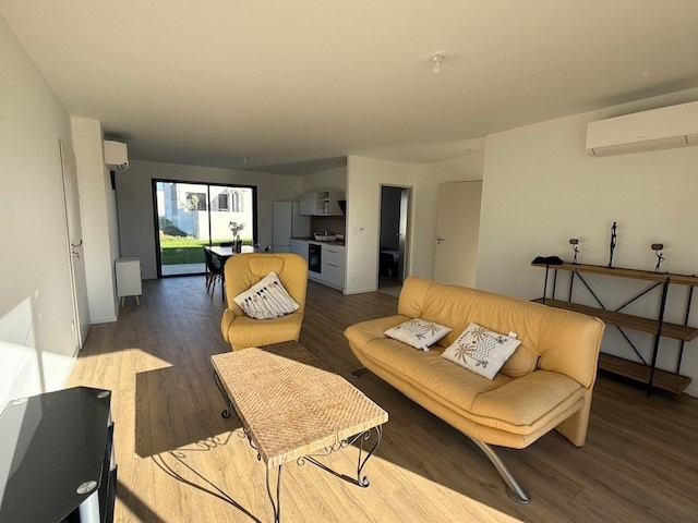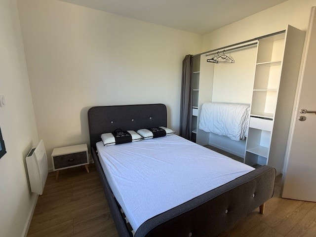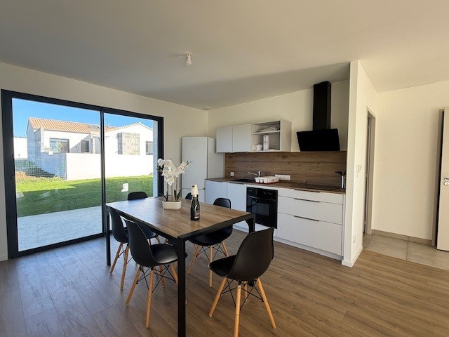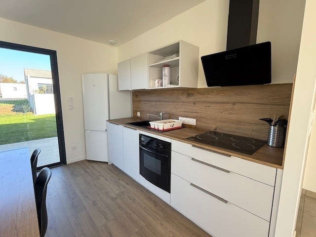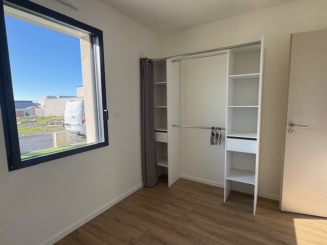 La Roche/Yon, quartier Brossardière, très beau plain-pied NEUF en location meublée comprenant séjour-salon traversant cuisine entièrement aménagée et équipée d'une plaque de cuisson, hotte, four, lave-vaisselle, réfrigérateur avec congélateur, dégagement avec deux chambres disposant d'un rangement type dressing, salle d'eau avec placard, sèche serviette et ballon thermodynamique, WC, 3ème chambre indépendante avec rangement dressing, douche et lavabo.