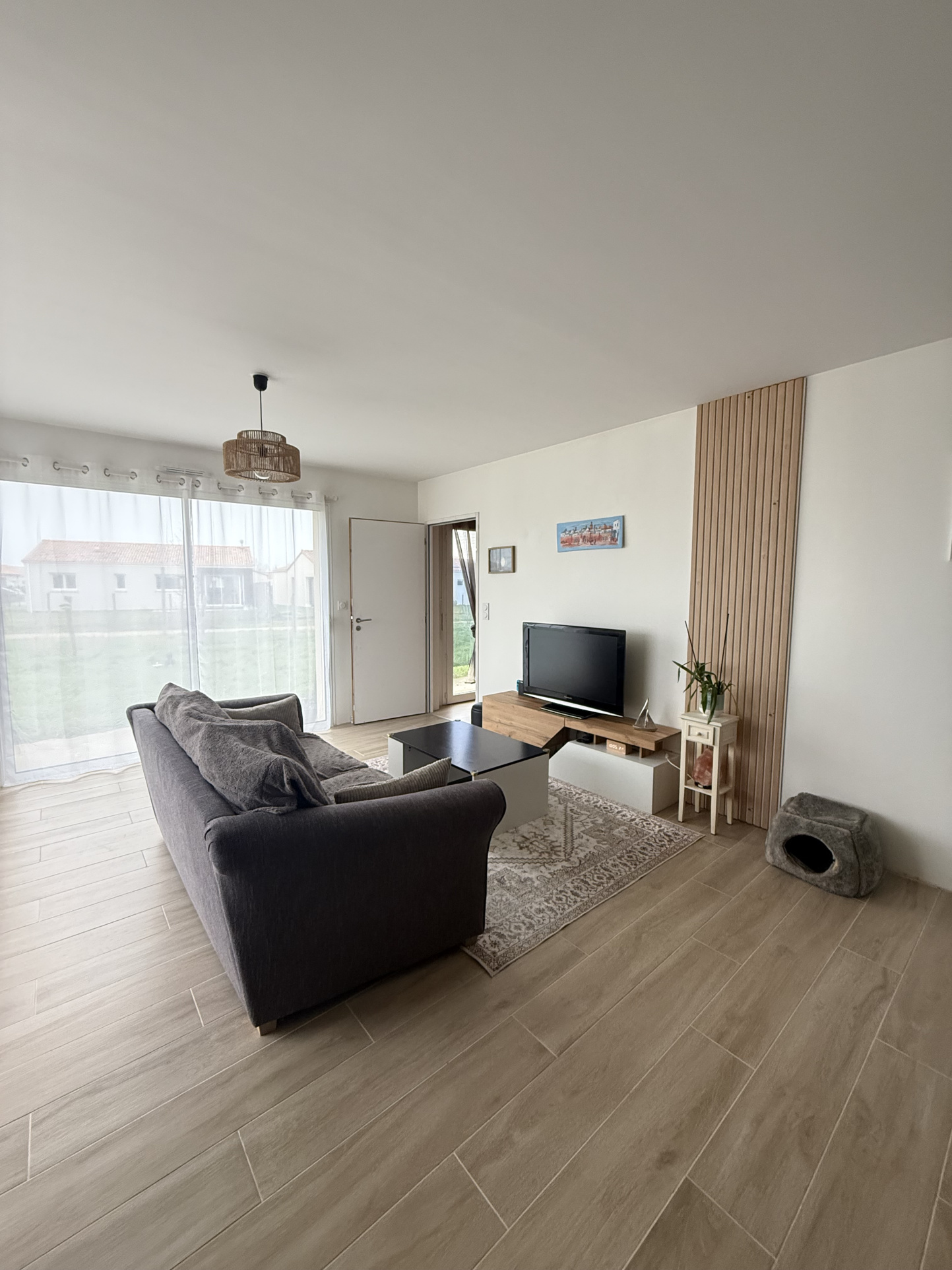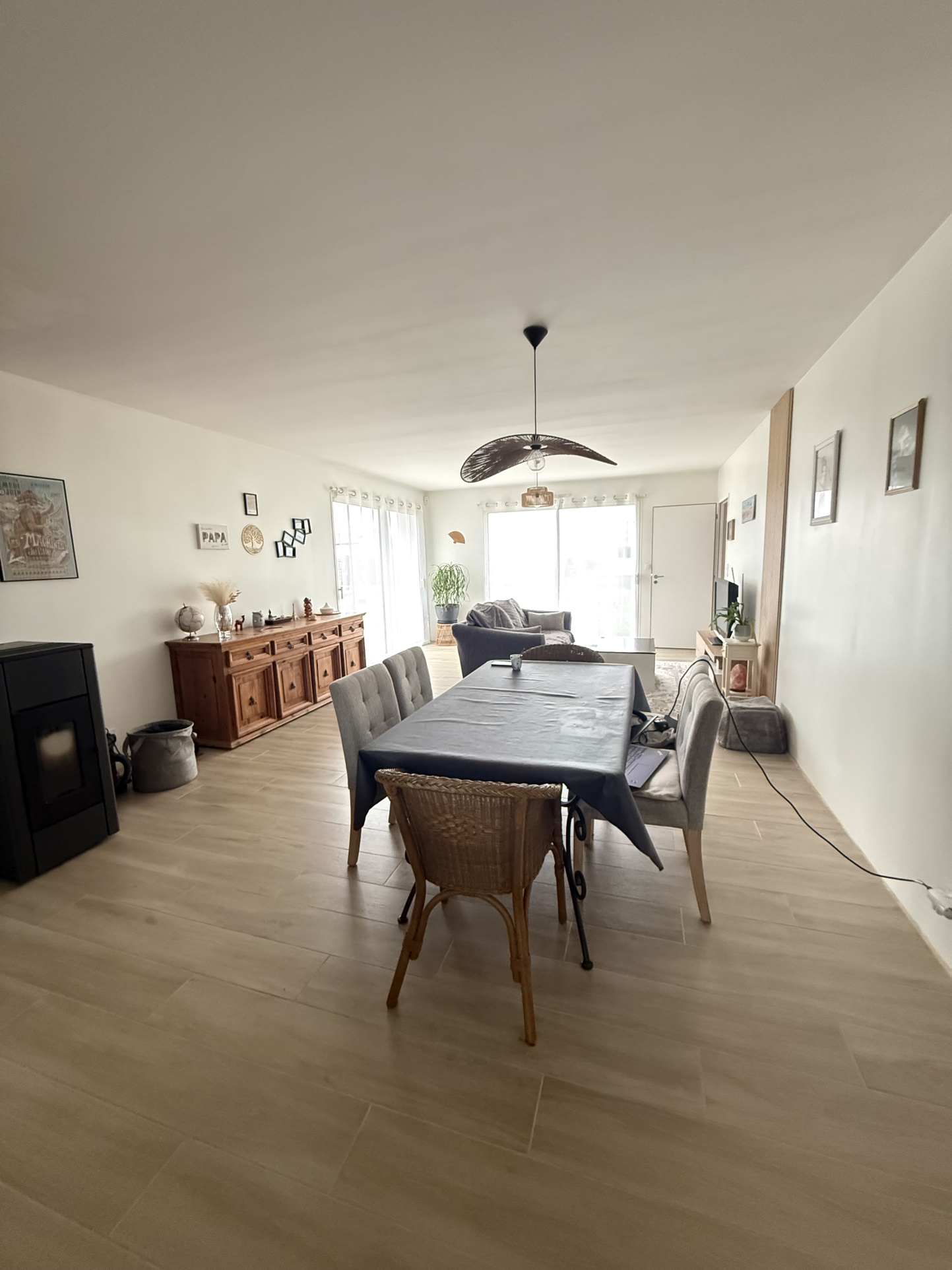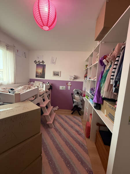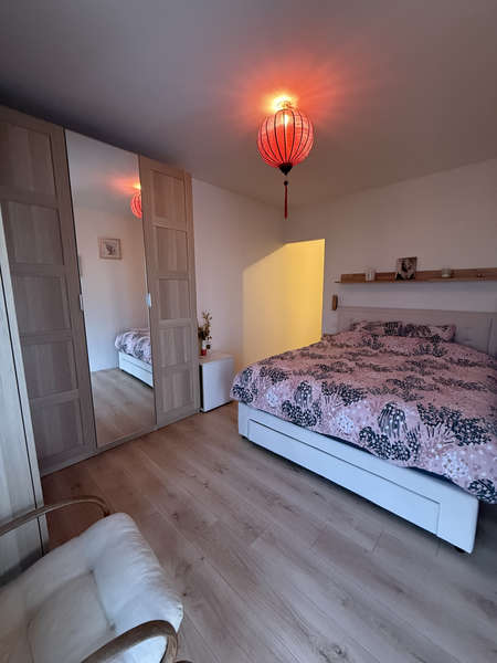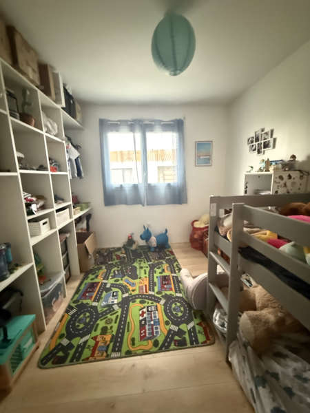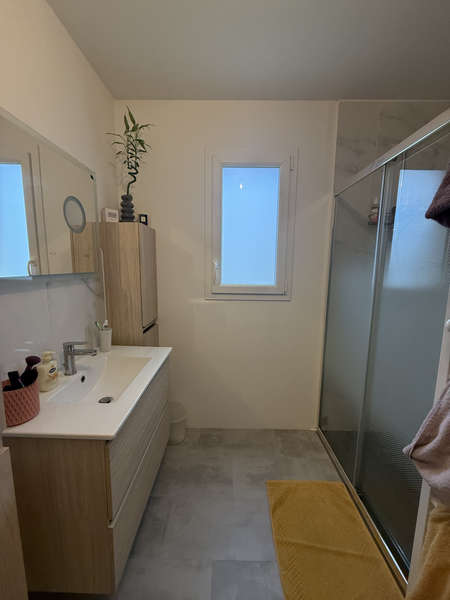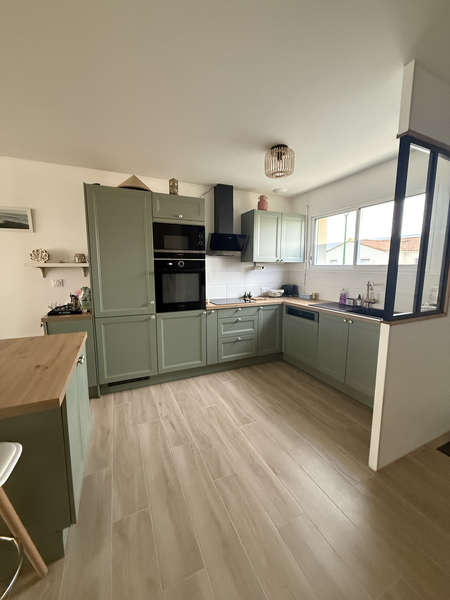 Entrée sur grand salon-séjour avec coin cuisine aménagée & équipée (four, micro-ondes, hotte, plaque de cuisson induction, lave-vaisselle, frigo), chambre avec placard, salle de bains & wc attenants, buanderie, et dégagement desservant 2 chambres avec placard, salle d'eau & wc séparés.