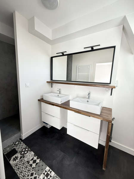 Vous bénéficierez également de WC indépendants ainsi que d’une chambre confortable avec salle d’eau attenante comprenant une grande douche, double vasque et sèche serviette, pour un confort optimal au quotidien.