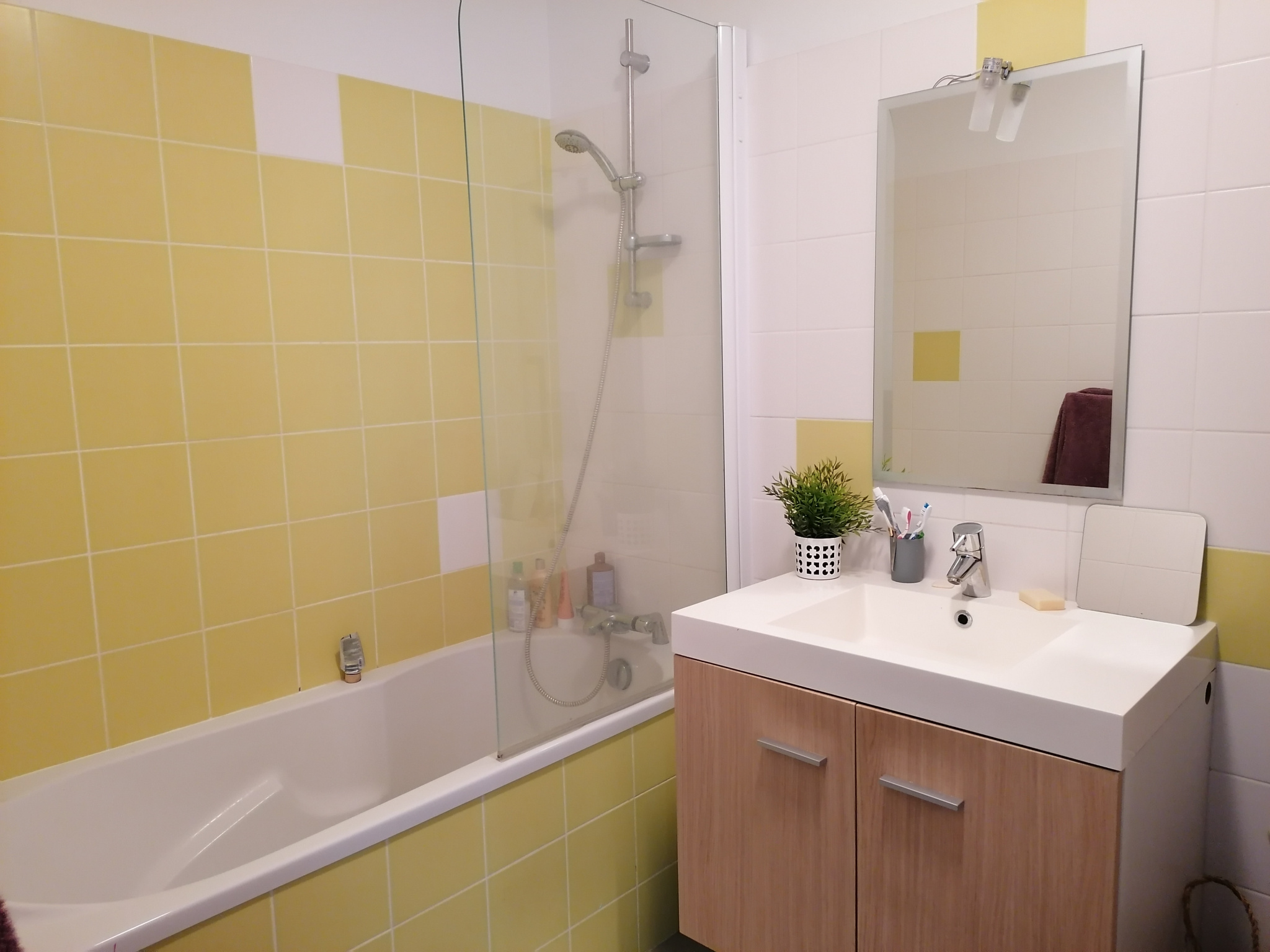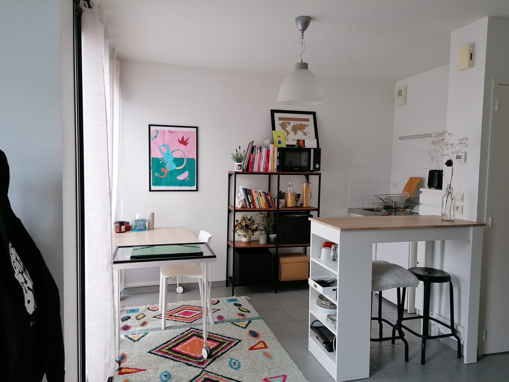 Entrée sur pièce de vie avec coin cuisine, salle de bains & wc