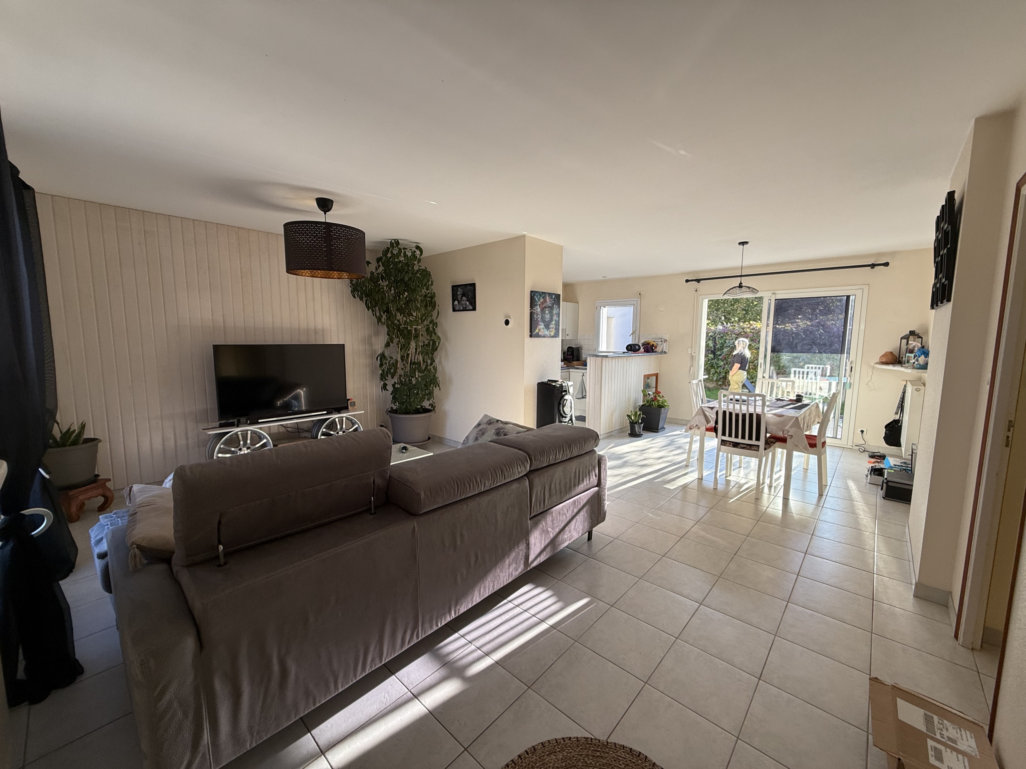 Elle se compose d’un séjour lumineux avec salle à manger et cuisine ouverte aménagée, d’un dégagement desservant deux chambres avec placards, un bureau, une salle d’eau et des WC séparés. Vous apprécierez également un spacieux garage, une terrasse et un jardin clos sans vis-à-vis, idéalement exposé.