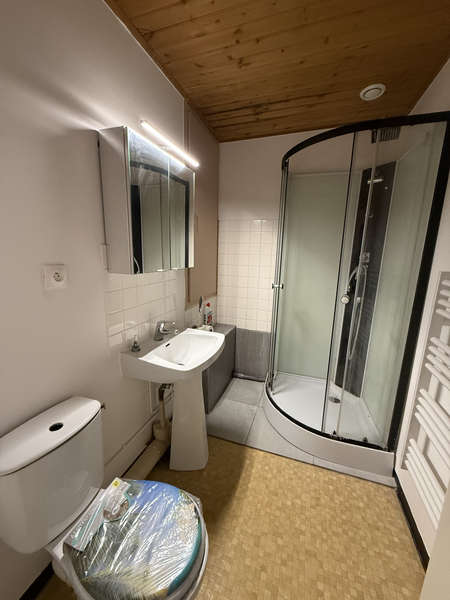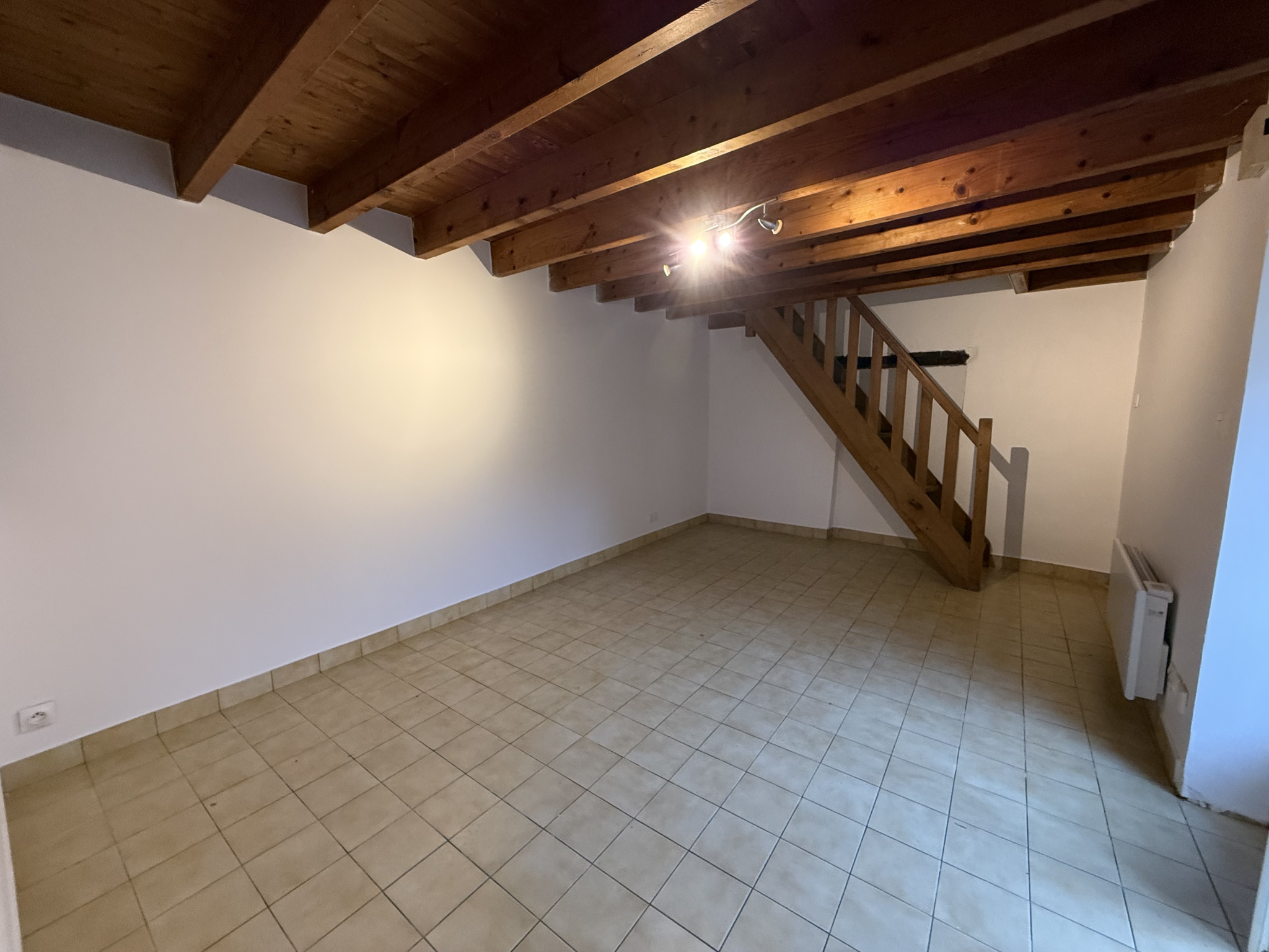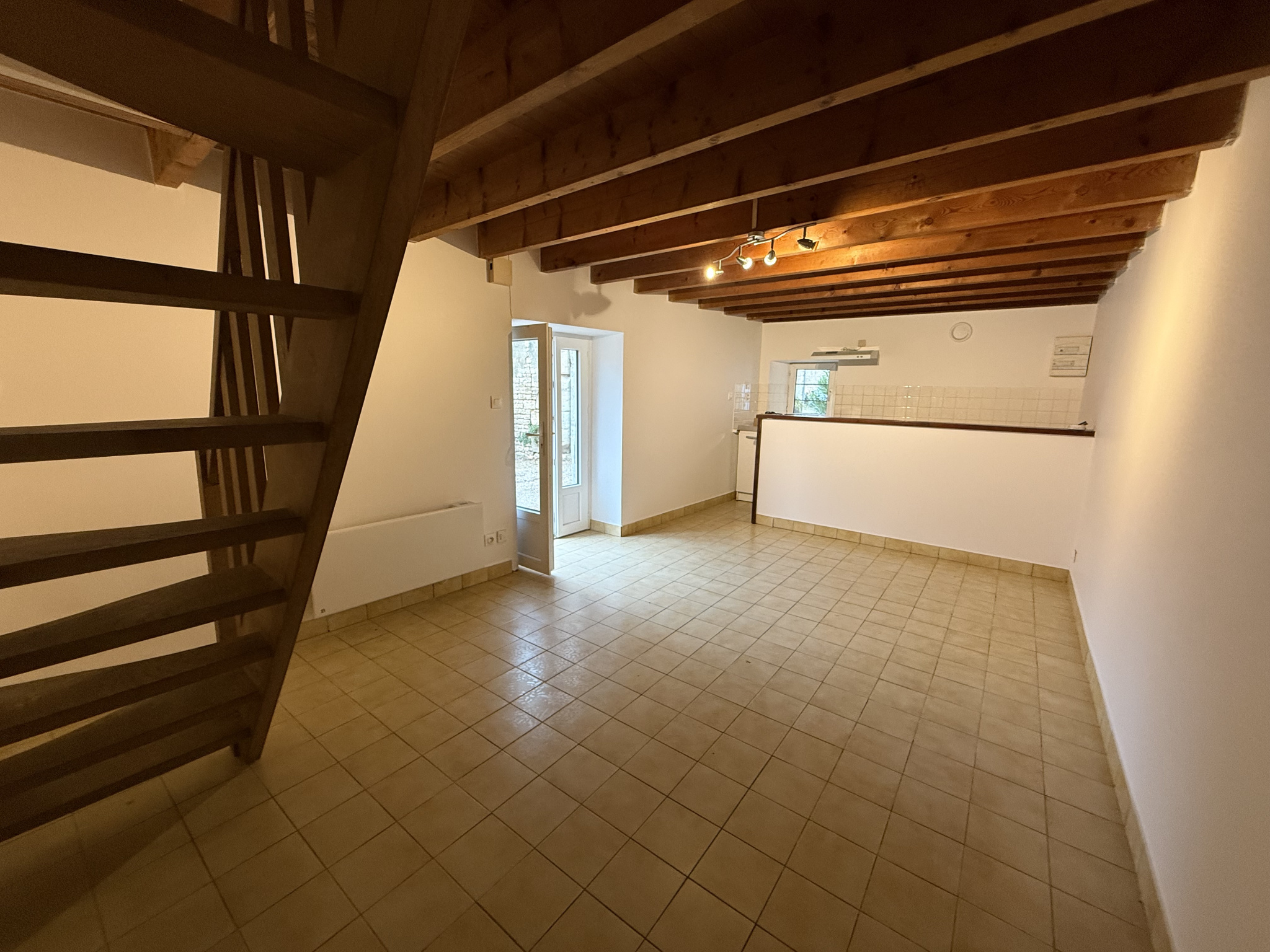 Au rez-de-chaussée, profitez d’un séjour avec cuisine ouverte. À l’étage, un palier dessert une chambre spacieuse, ainsi qu’une salle d’eau avec WC.