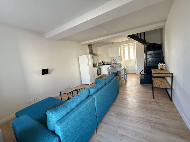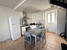 Au rez-de-chaussée: agréable pièce de vie traversante avec espace salon, et cuisine aménagée et équipée (plaque, hotte, table de cuisson).