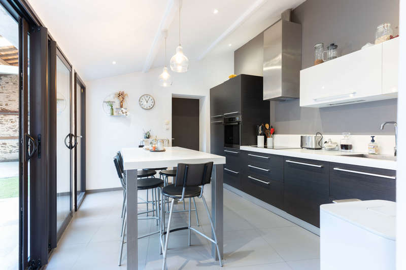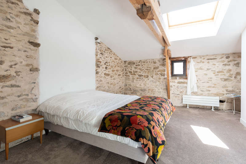 Au rez-de-chaussée: une entrée style verrière, dessert un séjour (22,80m2) et un salon (22,80m2) avec cheminée insert, tous deux habillés de poutres et de pierres apparentes. Cuisine aménagée et équipée (12,80m2), ouverte sur la cour (35m2), orientée Ouest et close de murs en pierres. Une buanderie, dans le prolongement, complète le rez-de-chaussée. Préau (38m2), accessible depuis la rue. Dépendance