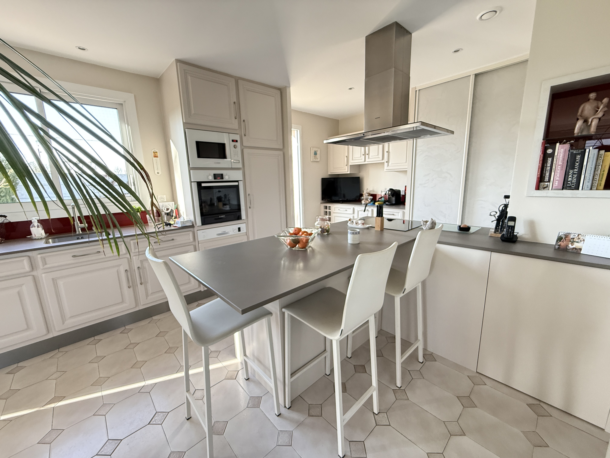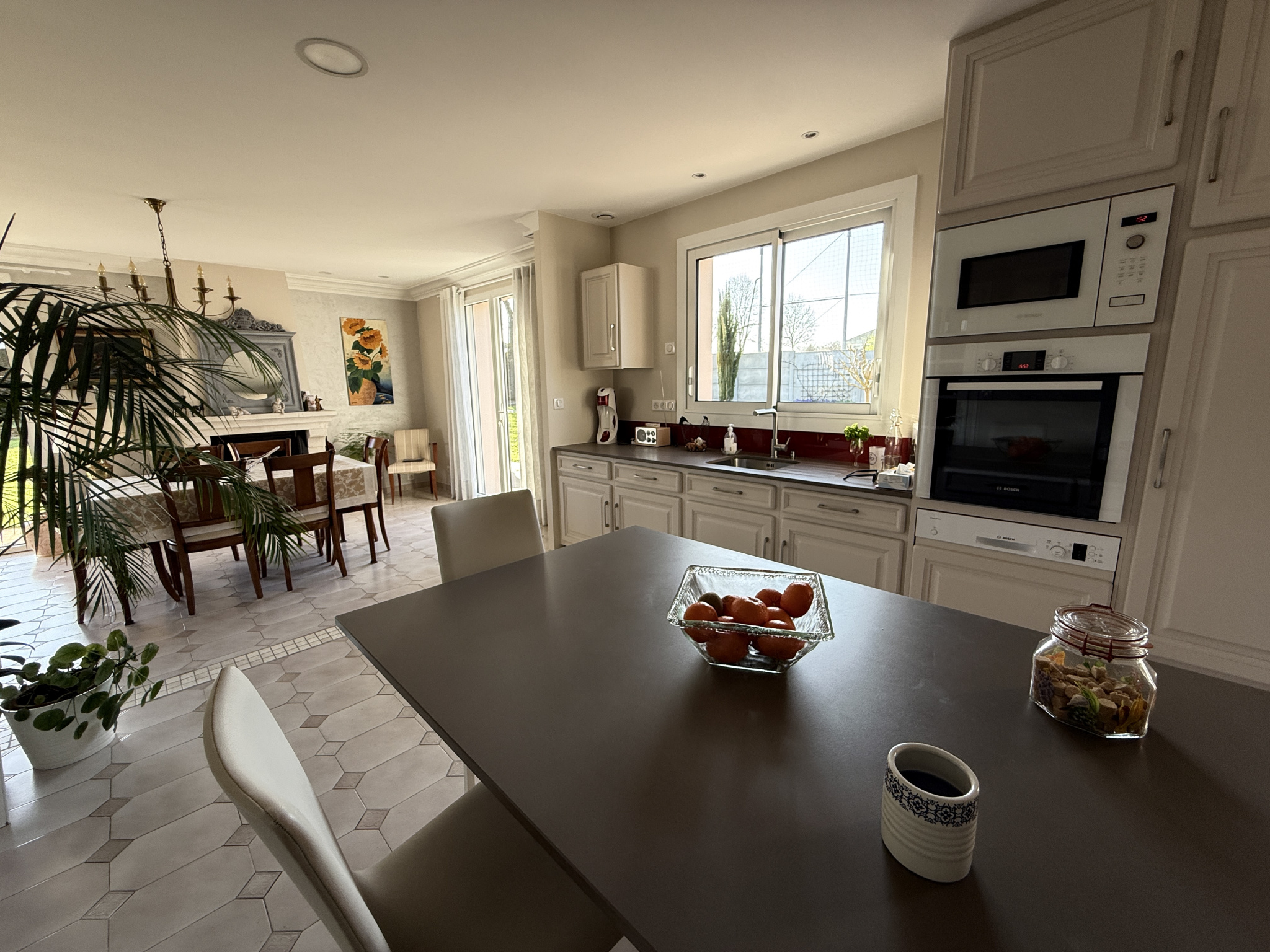 Cuisine indépendante (19m2), aménagée, équipée (lave-vaisselle, réfrigérateur, plaques induction, four, micro-ondes, hotte), et ouverte sur la terrasse