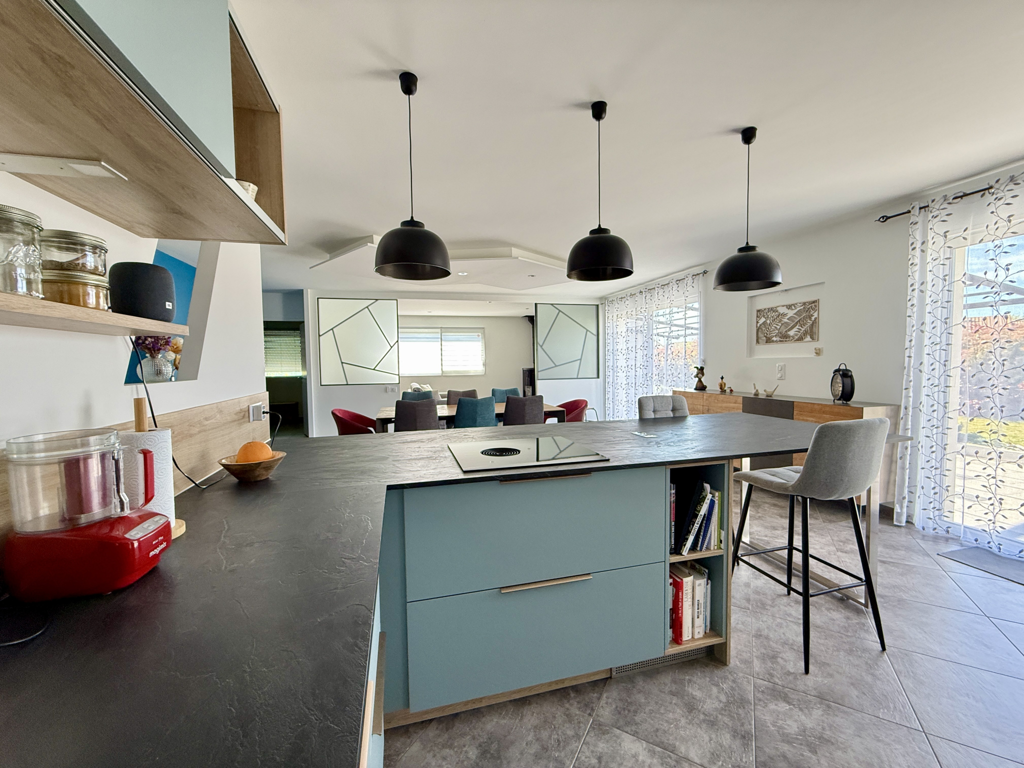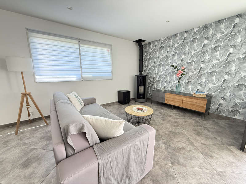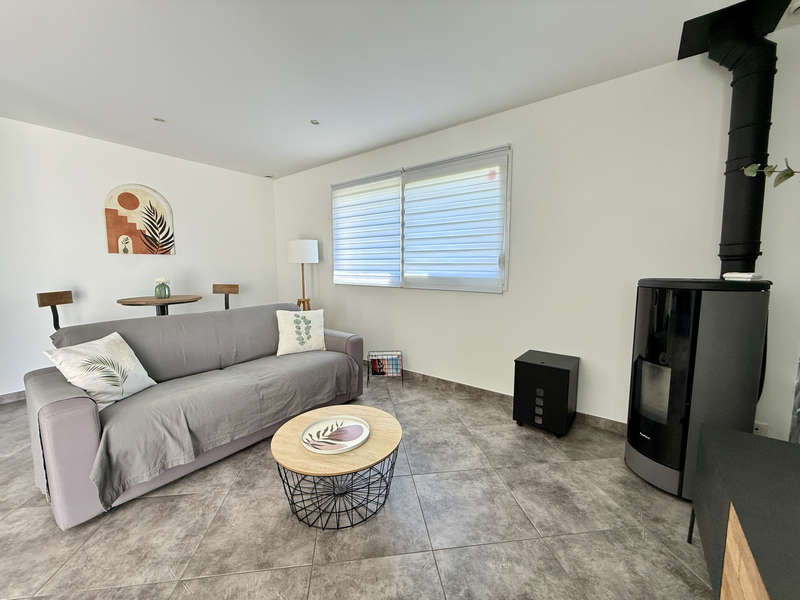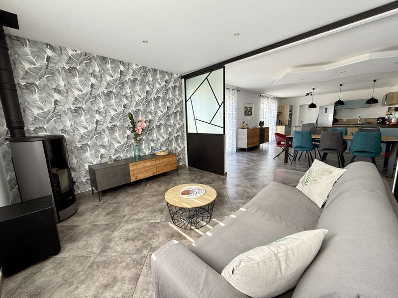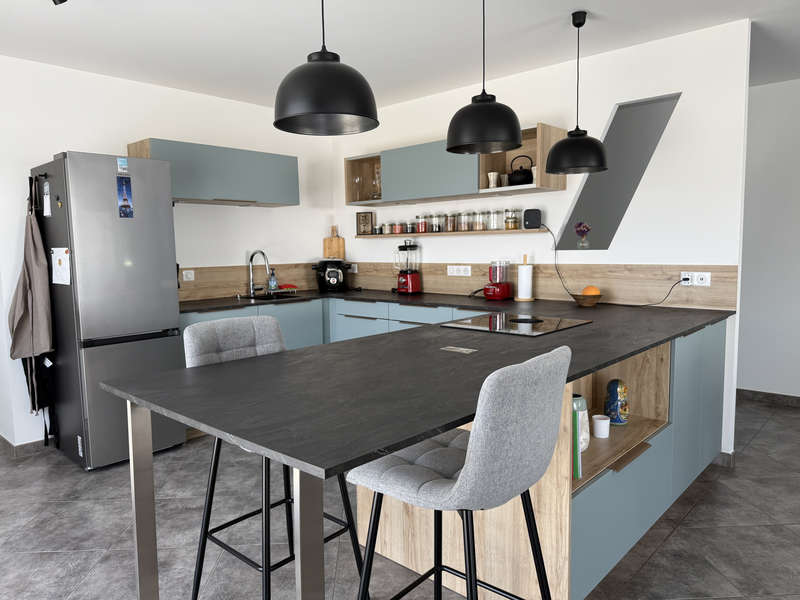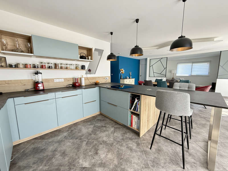 Hall d'entrée avec placard, séjour de 33m2 ouvert sur la cuisine aménagée et équipée de12m2. Depuis la pièce de vie, deux grandes baies à galandage permettent de profiter pleinement de la terrasse exposée plein Sud!