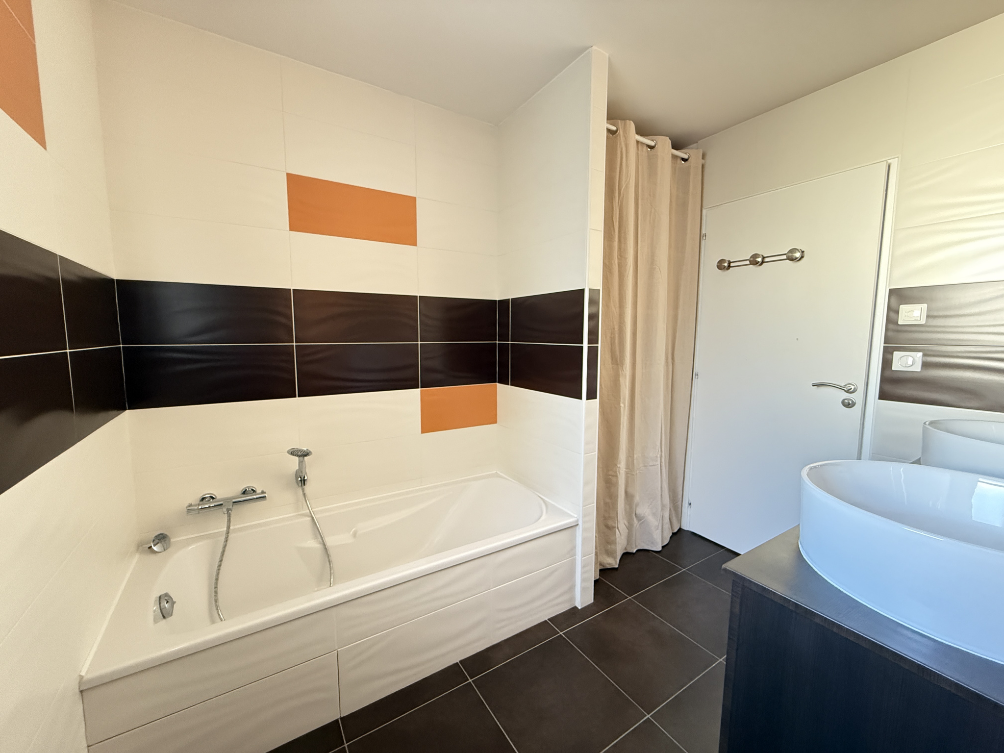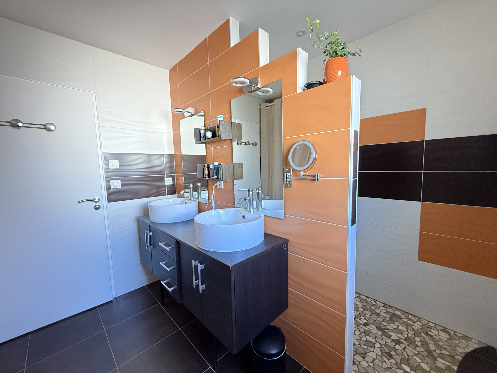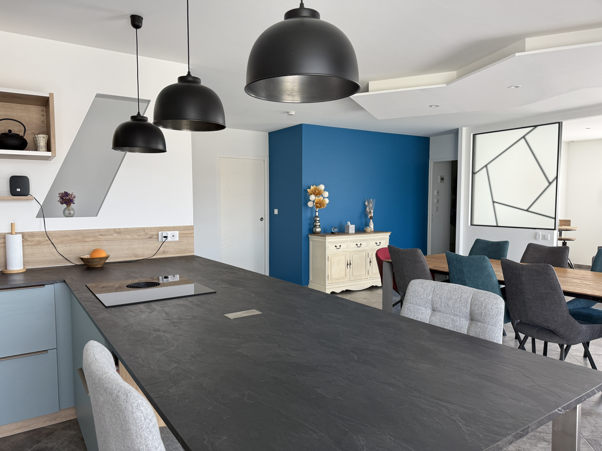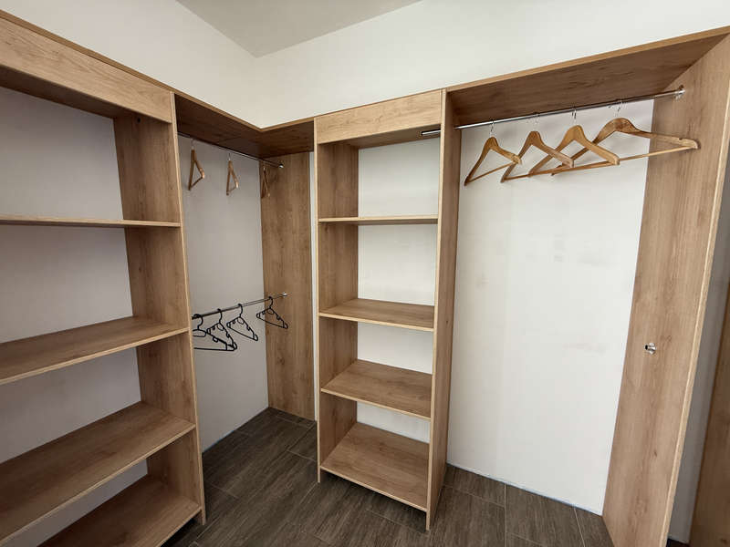 Hall d'entrée avec placard, séjour de 33m2 ouvert sur la cuisine aménagée et équipée de12m2. Depuis la pièce de vie, deux grandes baies à galandage permettent de profiter pleinement de la terrasse exposée plein Sud!