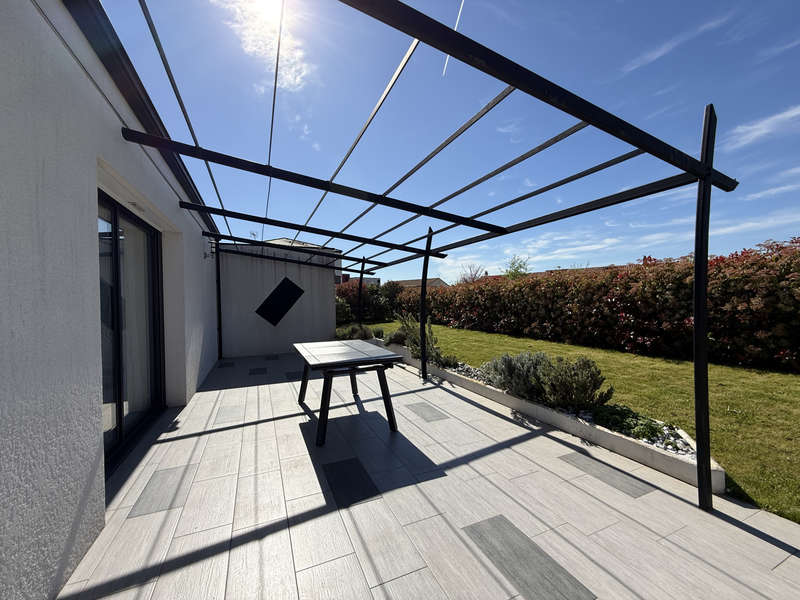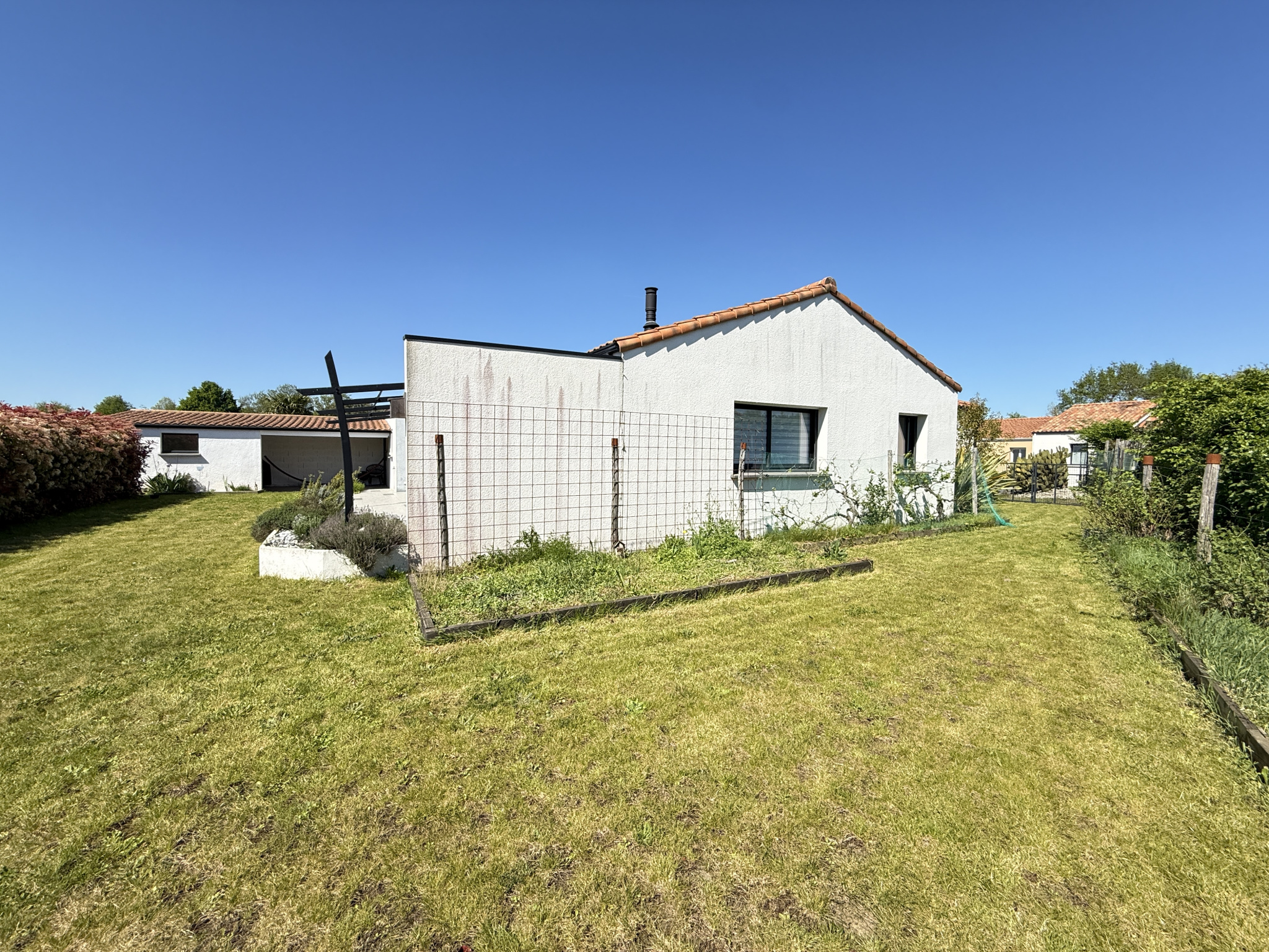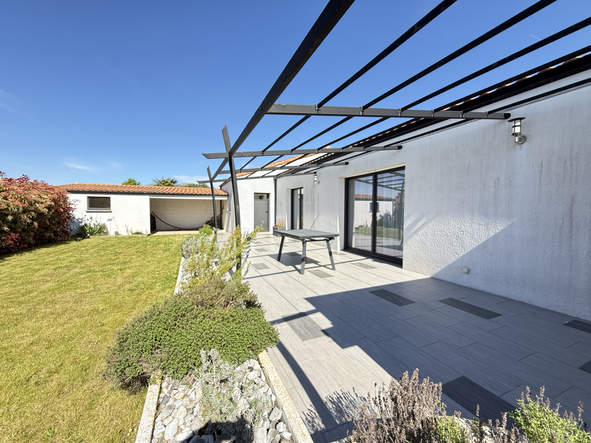 A l'extérieur, terrasse avec pergola, plein Sud et sans vis-à-vis. Idéal pour les barbecue entre amis! Sur le côté de la maison, espace potager