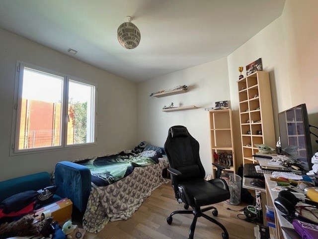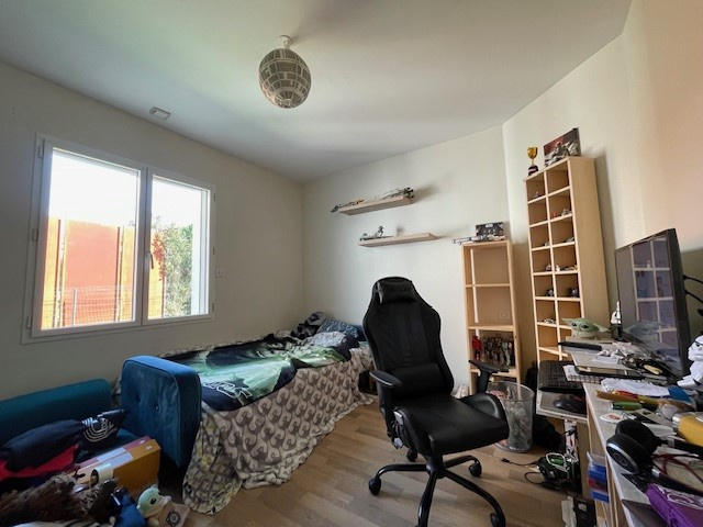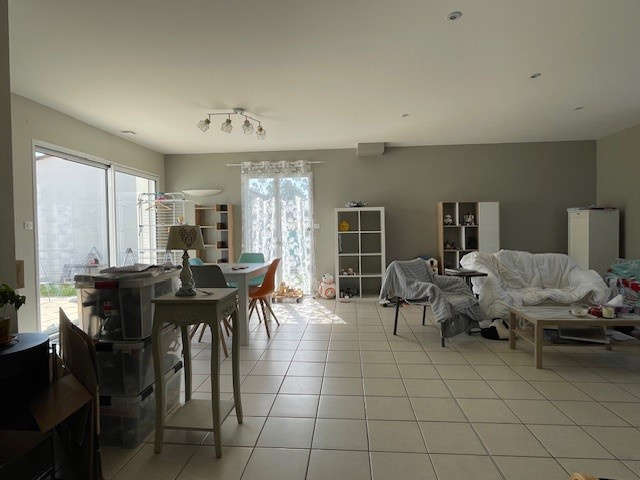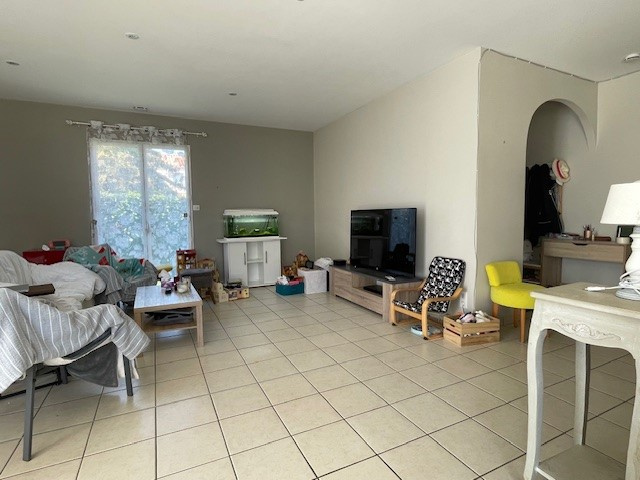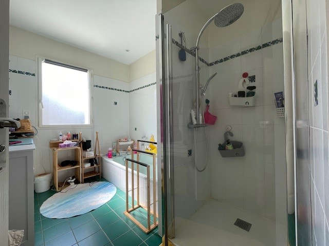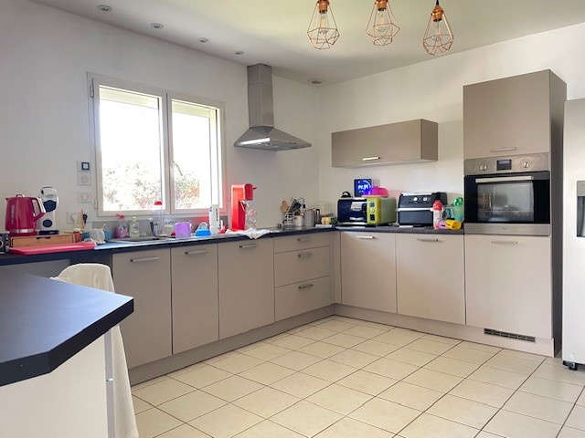 hall d'entrée avec placard, cuisine aménagée indépendante, séjour-salon avec trois baies vitrées donnant sur terrasse et jardin, quatre chambres dont trois avec placard, salle de bains avec douche et baignoire, WC, buanderie avec placard, garage. Chauffage par le sol, pompe à chaleur, ventilation double flux.